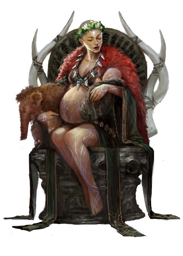 Fandarra wird im Reich der Mammutfürsten vor allem als Göttin der Lebenszyklen verehrt - einschließlich Fruchtbarkeit, Geburt, Leben und Tod. Lokale Legenden besagen, dass Fandarra aus dem Schoß der Erde, der legendären Höhle Atakal, als erstes Lebewesen geboren wurde. Aus ihr entsprang alles andere Leben. Sie gebar alle Menschen, alle Tiere und alle Gottheiten - mit Ausnahme von Pharasma, der Richterin der Seelen, die außerhalb des Zyklus von Leben und Tod existiert. Das Blut, das bei der Geburt vergossen wurde, tränkte den Boden, machte ihn fruchtbar und ließ Pflanzen wachsen. Blut, Tod und Schmerz sind nichts, was man fürchten müsste. Wie das Leben sind sie ein normaler und integraler Bestandteil des Lebenszyklus und sollten respektiert werden. Fandarra ist die Mutter von allem, auch bekannt als die Mutter der Erde oder die Blutmutter, und ist eine der am meisten verehrten Gottheiten im Reich der Mammutfürsten. Zusätzlich zu ihrer Rolle als Göttin der Lebenszyklen und des Blutes ist Fandarra auch eine Göttin des Wissens. Wie die Ältesten die Kinder erziehen, so hat Fandarra den Wesen dieser Welt ihre Weisheit vermittelt. Außerhalb des Reichs der Mammutfürsten ist Fandarra vor allem als Göttin der Riesen bekannt. Im Reich der Mammutfürsten wird sie als schwangere Kellidin mit kahlgeschorenem Kopf dargestellt, der von einem Blumenlorbeer gekrönt wird. Sie trägt eine Messerkette, die sie gegen diejenigen einsetzt, die den Kreislauf des Lebens an sich reißen wollen. Auf ihren Schultern ruht ein Pelzmantel, der zu der Region passt, in der sie verehrt wird - in der Regel Mammut, Wolf oder Bär. Sie trägt einen Säugling auf dem einen Arm und ein Jungtier auf dem anderen. Normalerweise ist dieses Tier ein Mammut, obwohl es bei Gruppen, die andere Tiere mehr schätzen, variieren kann. Das religiöse Symbol von Fandarra ist eine Mondsichel, die aus einem Berg aufsteigt. Ihre Anbeter schätzen das Gleichgewicht und die Zyklen des Lebens, Eigenschaften, die es ihrem Glauben ermöglichen, sich gut mit dem Glauben und den Traditionen einer Vielzahl von Anhängern zu verbinden. Ihre Verehrer streben oft nach Führungspositionen oder arbeiten als Doulas, Erzieher oder Totenführer, die sich um die Verstorbenen kümmern. Viele von Fandarras Anhängern schätzen ihre Familie, ob sie nun von ihrem eigenen Blut abstammen oder durch Liebesbande adoptiert wurden; darüber hinaus betrachten viele Freunde, Clanmitglieder und Haustiere als erweiterte Familie. Fandarra und ihre Verehrer verabscheuen Nekromantie, Untote und Magie, die die Realität verändern oder den Geist anderer versklaven würde.